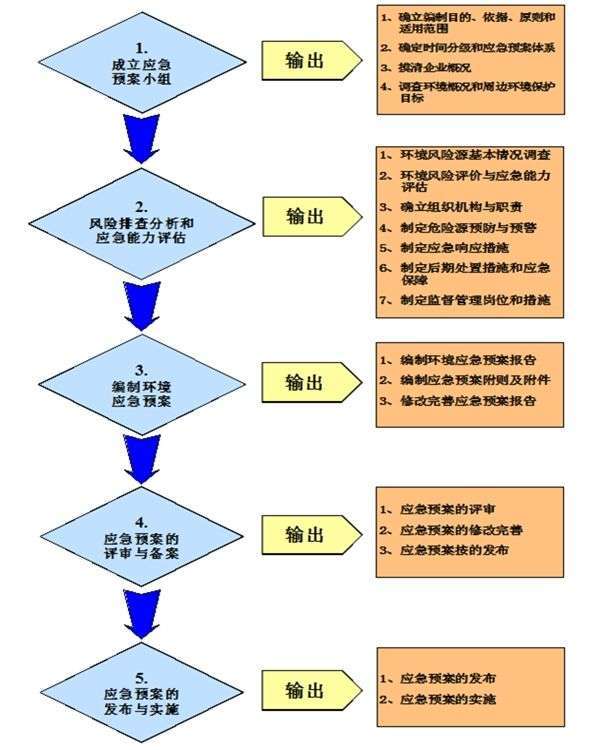 1、總則,包括編制目的、編制依據、適用范圍和工作原則等; 2、應急組織指揮體系與職責,包括領導機構、工作機構、地方機構或者現場指揮機構、環境應急專家組等; 3、預防與預警機制,包括應急準備措施、環境風險隱患排查和整治措施、預警分級指標、預警發布或者解除程序、預警相應措施等; 4、應急處置,包括應急預案啟動條件、信息報告、先期處置、分級響應、指揮與協調、信息發布、應急終止等程序和措施; 5、后期處置,包括善后處置、調查與評估、恢復重建等; 6、應急保障,包括人力資源保障、財力保障、物資保障、醫療衛生保障、交通運輸保障、治安維護、通信保障、科技支撐等; 7、監督管理,包括應急預案演練、宣教培訓、責任與獎懲等; 8、附則,包括名詞術語、預案解釋、修訂情況和實施日期等; 9、附件,包括相關單位和人員通訊錄、標準化格式文本、工作流程圖、應急物資儲備清單等。 【環境應急預案服務流程】 企業提供基本信息》報價》接受委托》收集技術資料》現場調查》編制環境應急預案》組織專家評審》修改完善》指導企業應急預案備案 【環境應急預案編制流程】 應急預案 【環境應急預案服務周期】 常規一個應急預案的服務周期是20個工作日左右。 |